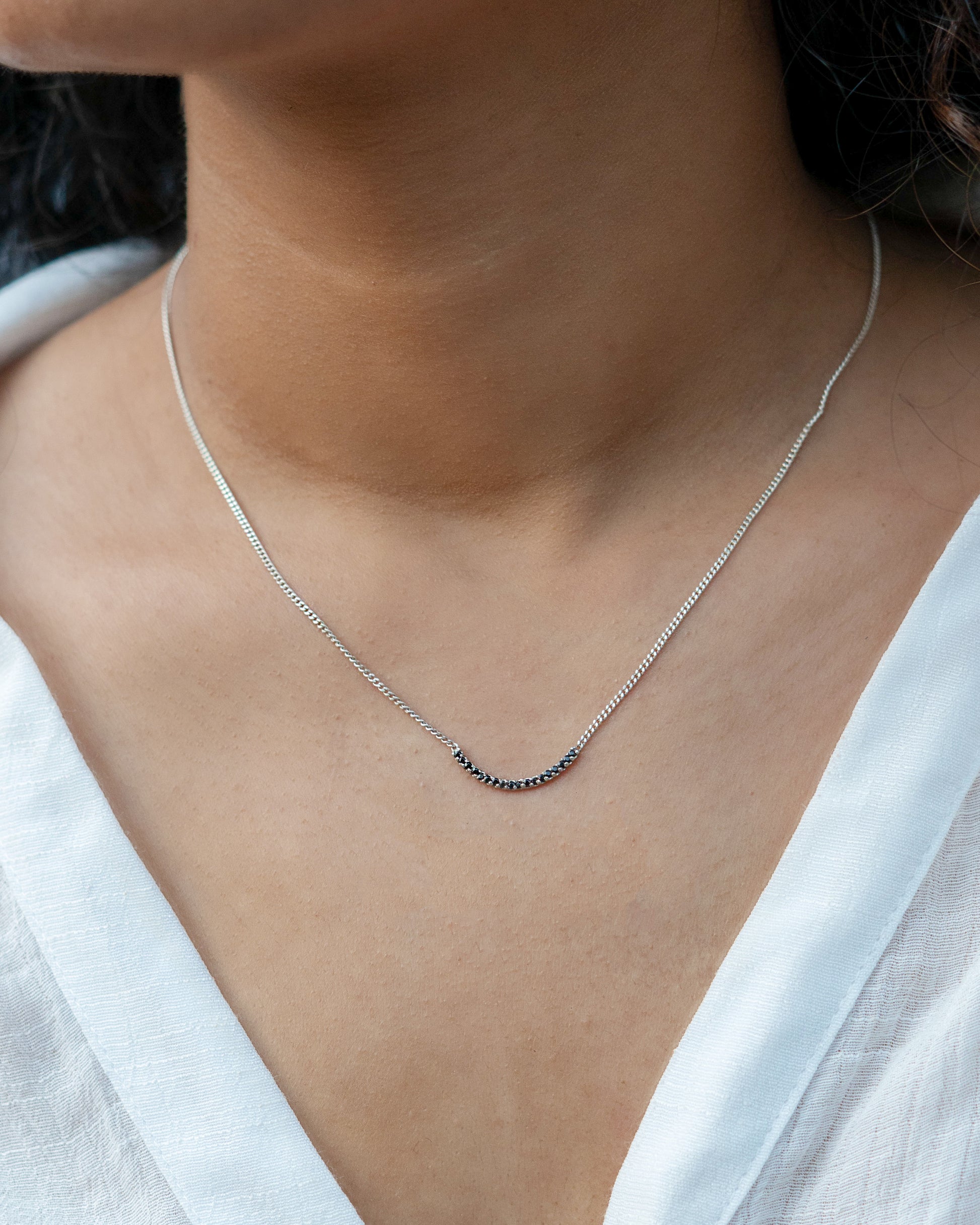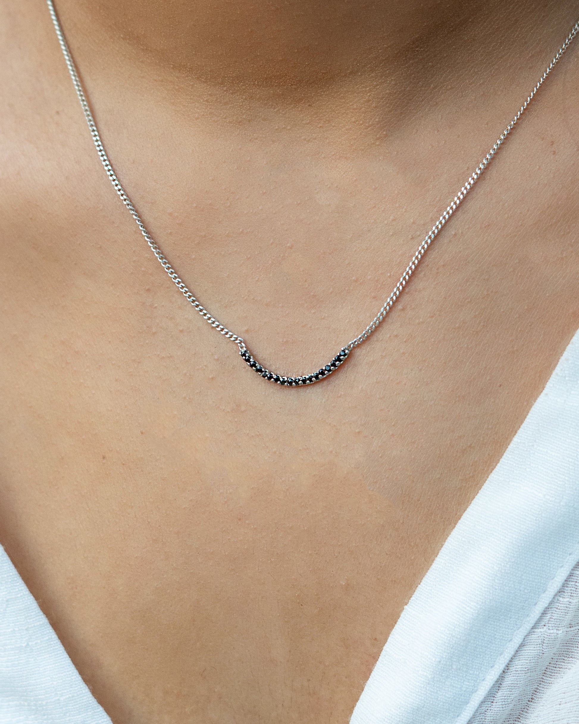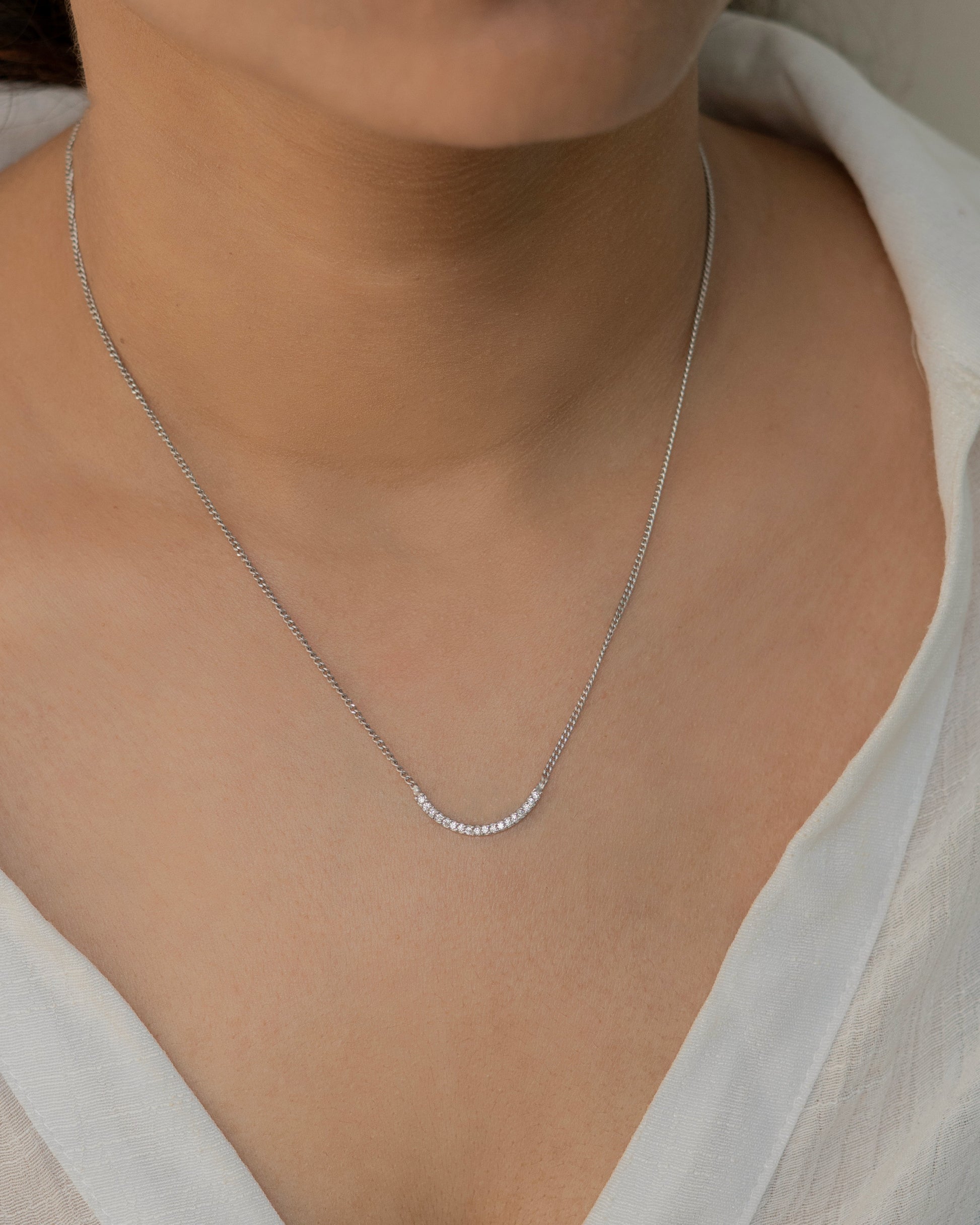 Creselle is designed to sit like a subtle smile at your collarbone. Crafted in 92.5% recycled silver with a warm rose gold (or silver) finish, this necklace features a soft, sculpted arc set with CZ stones. The result is bold but balanced—minimal, with just the right amount of edge.