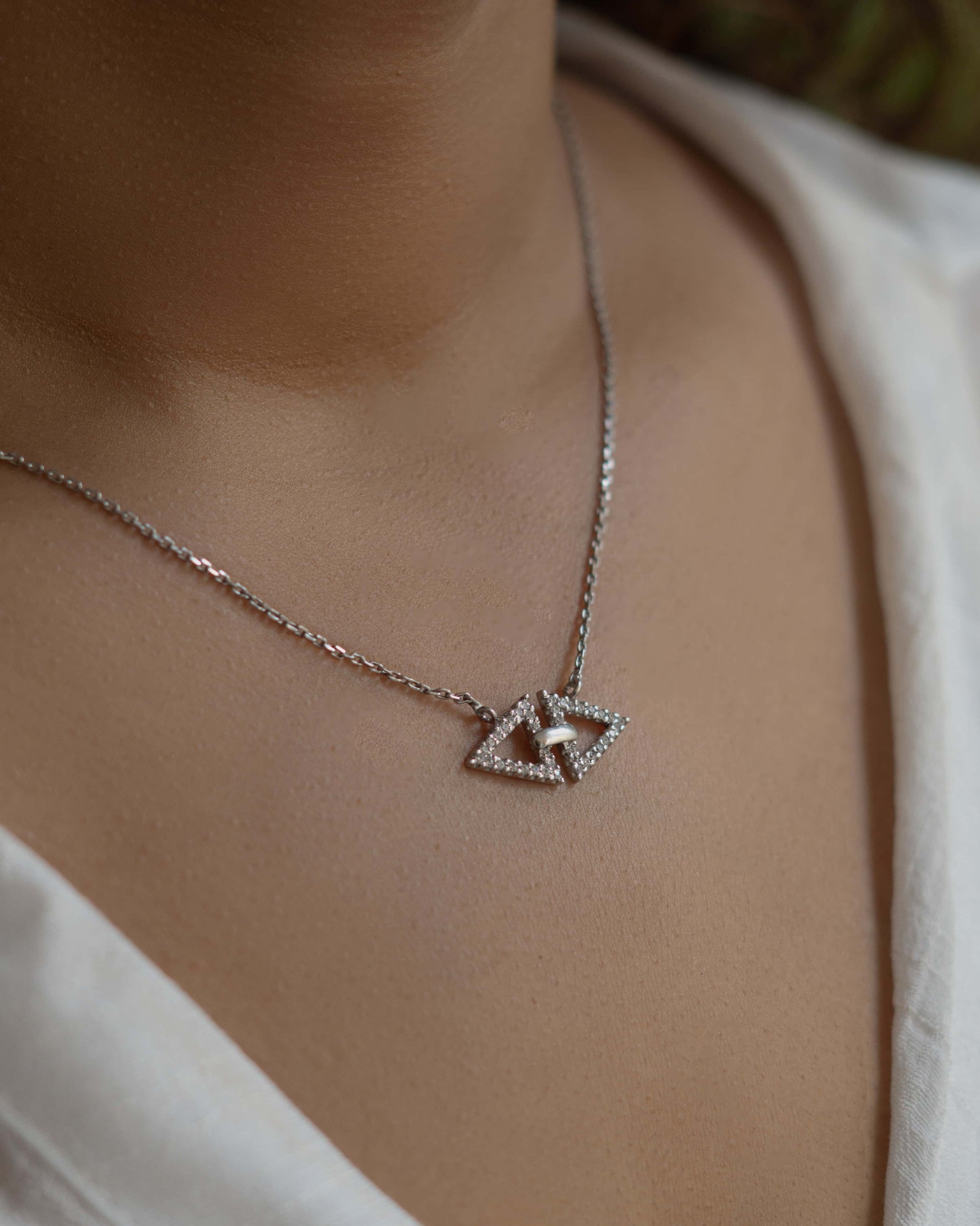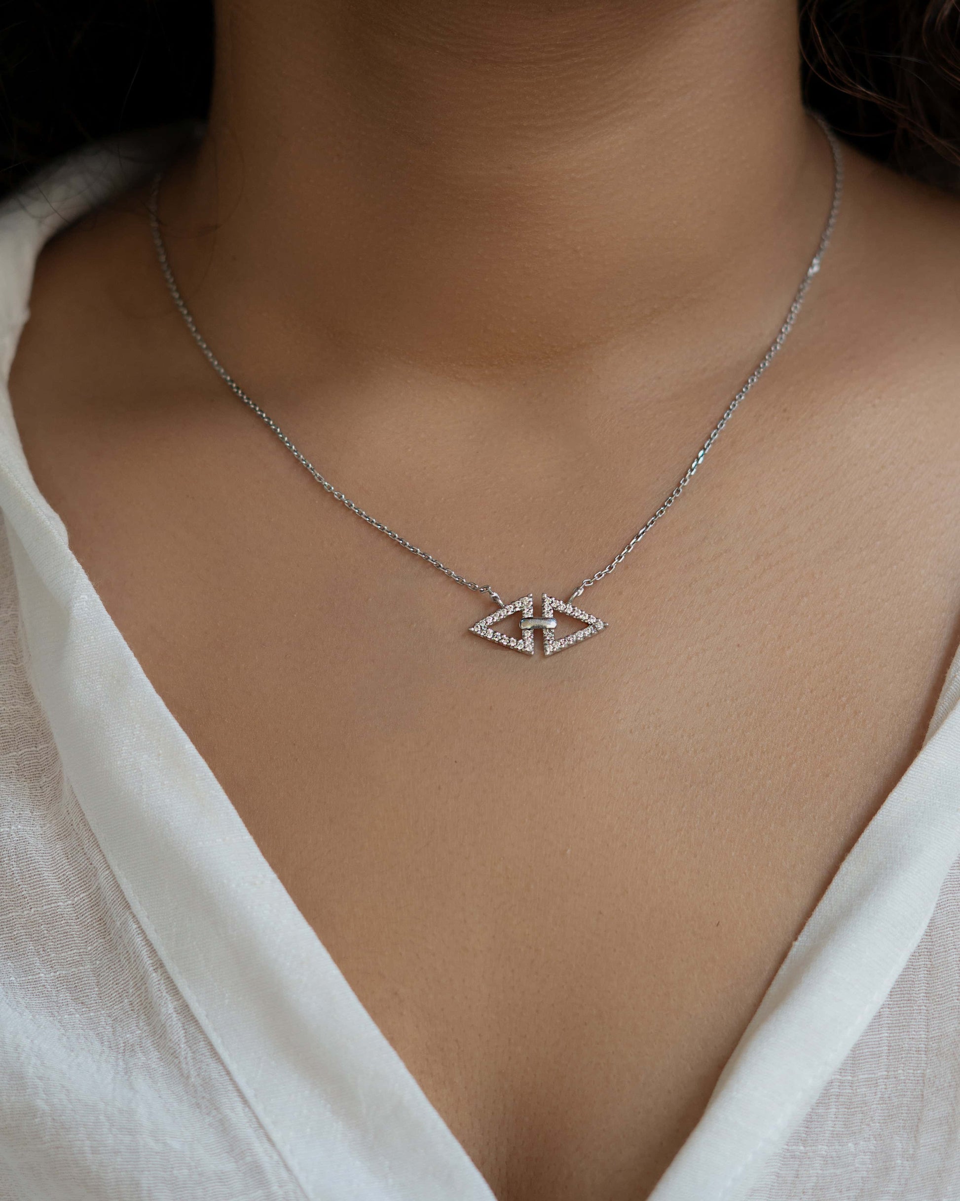 Dyad is a tale of two forces held in harmony. Crafted in 92.5% recycled silver and set with precision-cut white CZ stones, it features twin mirrored triangles anchored by a central bar—reflecting duality, balance, and intention. Bold in shape, yet minimal in message, it's a piece that speaks without raising its voice.