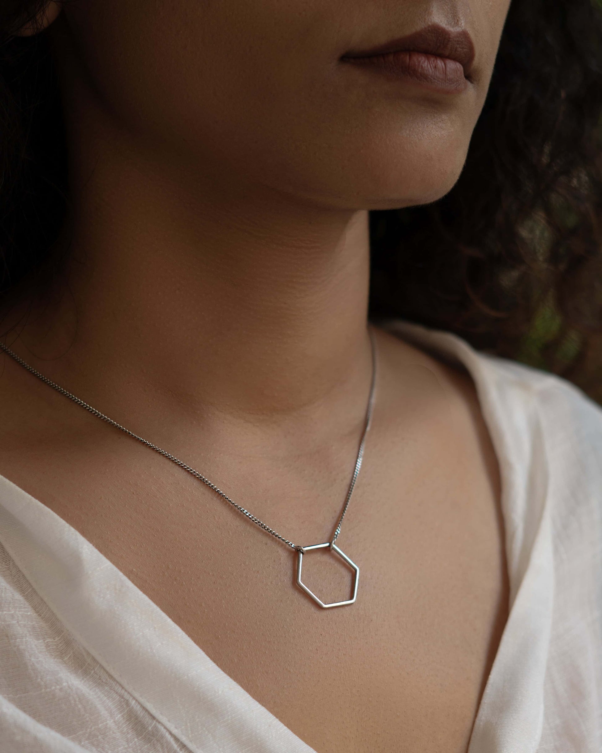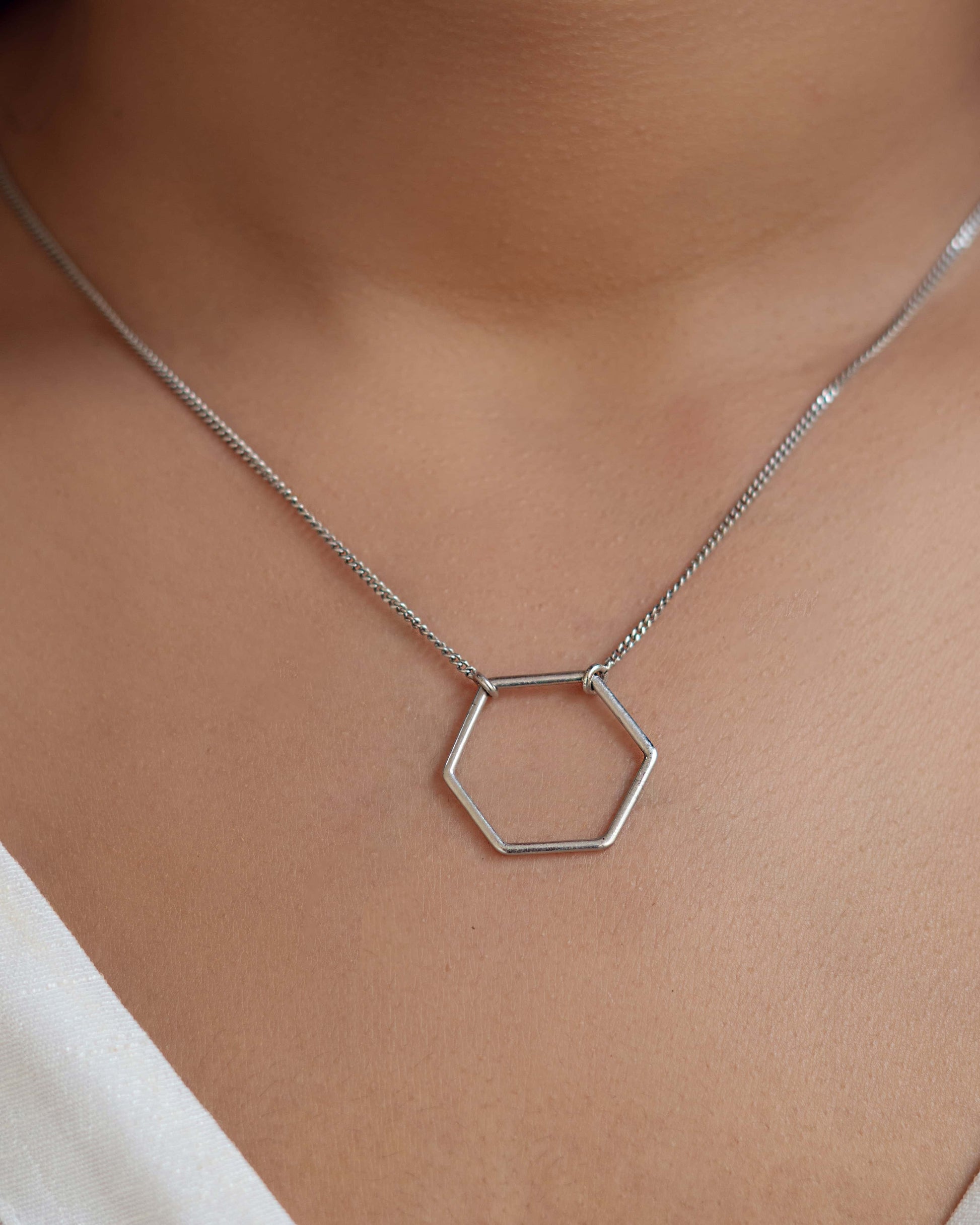 HexaLight is handcrafted in 92.5% recycled silver with a soft rose gold (or silver) finish, this pendant features a single open hexagon—unadorned, unafraid, and unmistakably modern. The clean lines and floating silhouette make it a quiet statement for women who lead with clarity and grace.