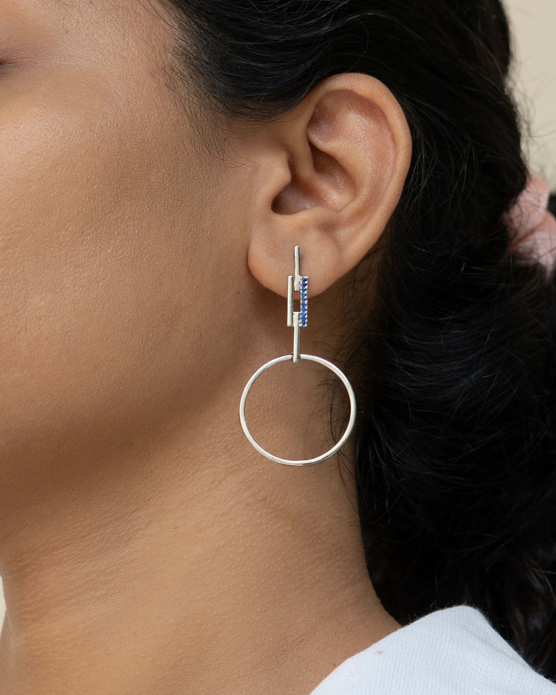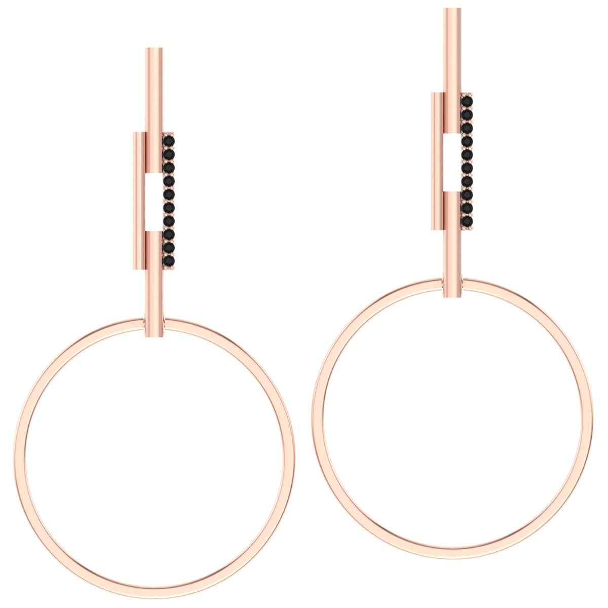 Mod Drop is geometry, redefined for the modern wardrobe. Crafted in 92.5% recycled silver with a warm rose gold (or silver) finish, this statement earring features a bold circular hoop suspended from a sleek vertical bar set with deep black CZ stones.