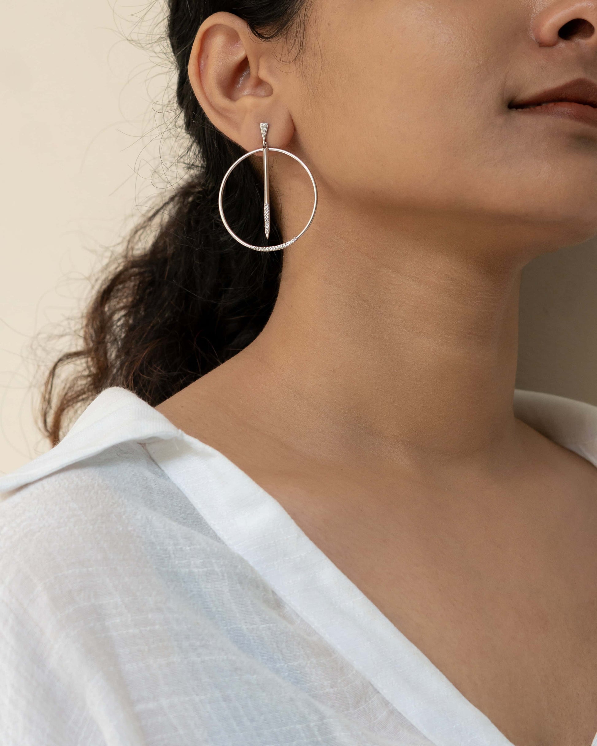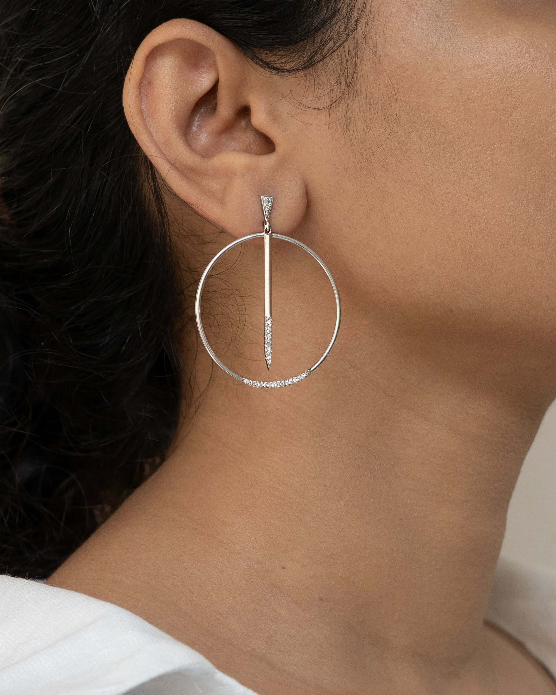 North Stark is for the woman who leads with quiet strength. Handcrafted in 92.5% recycled silver, this statement earring features a sleek, pointed bar suspended within a clean circular hoop—both softened and sharpened by a touch of pavé-set CZ diamonds.