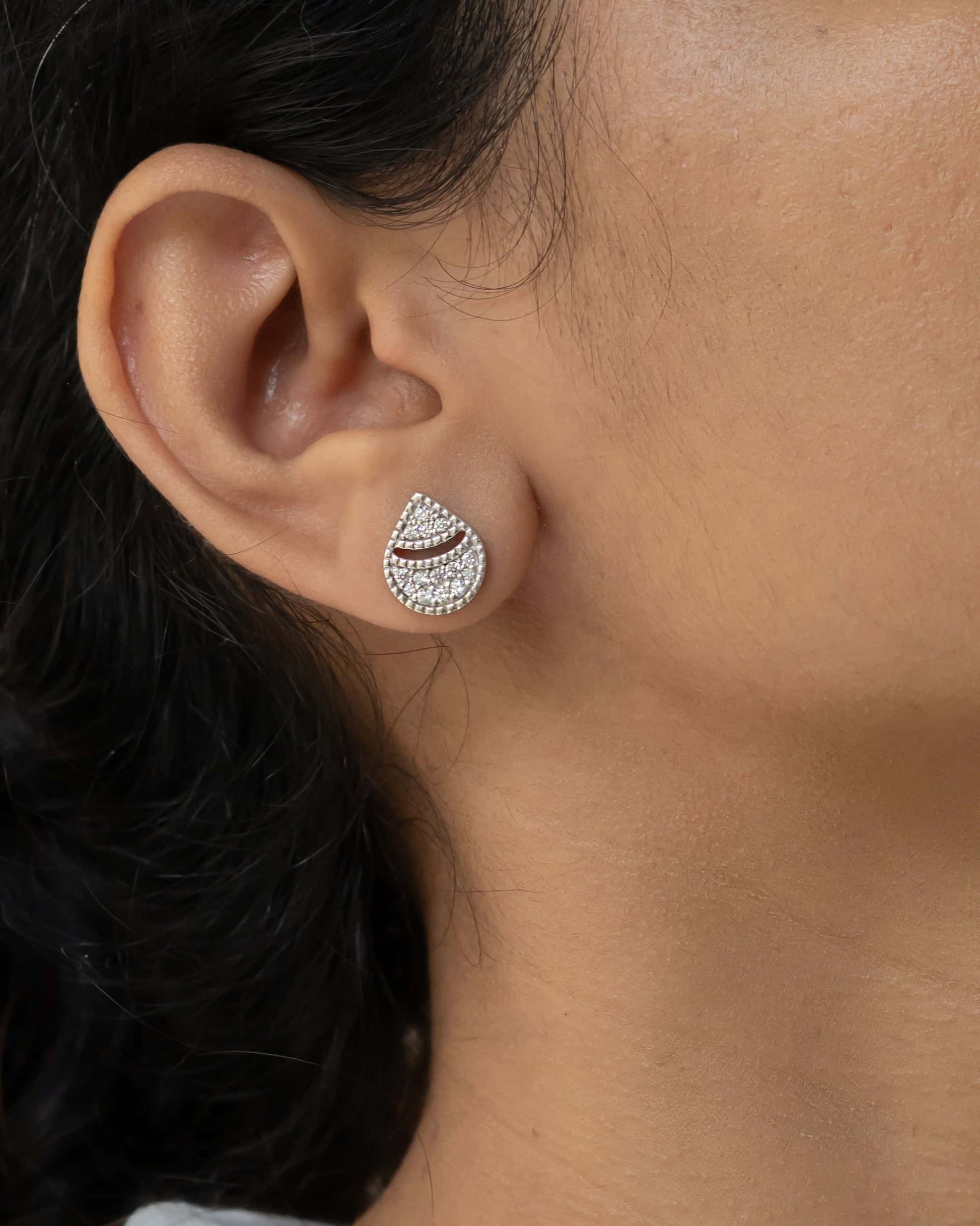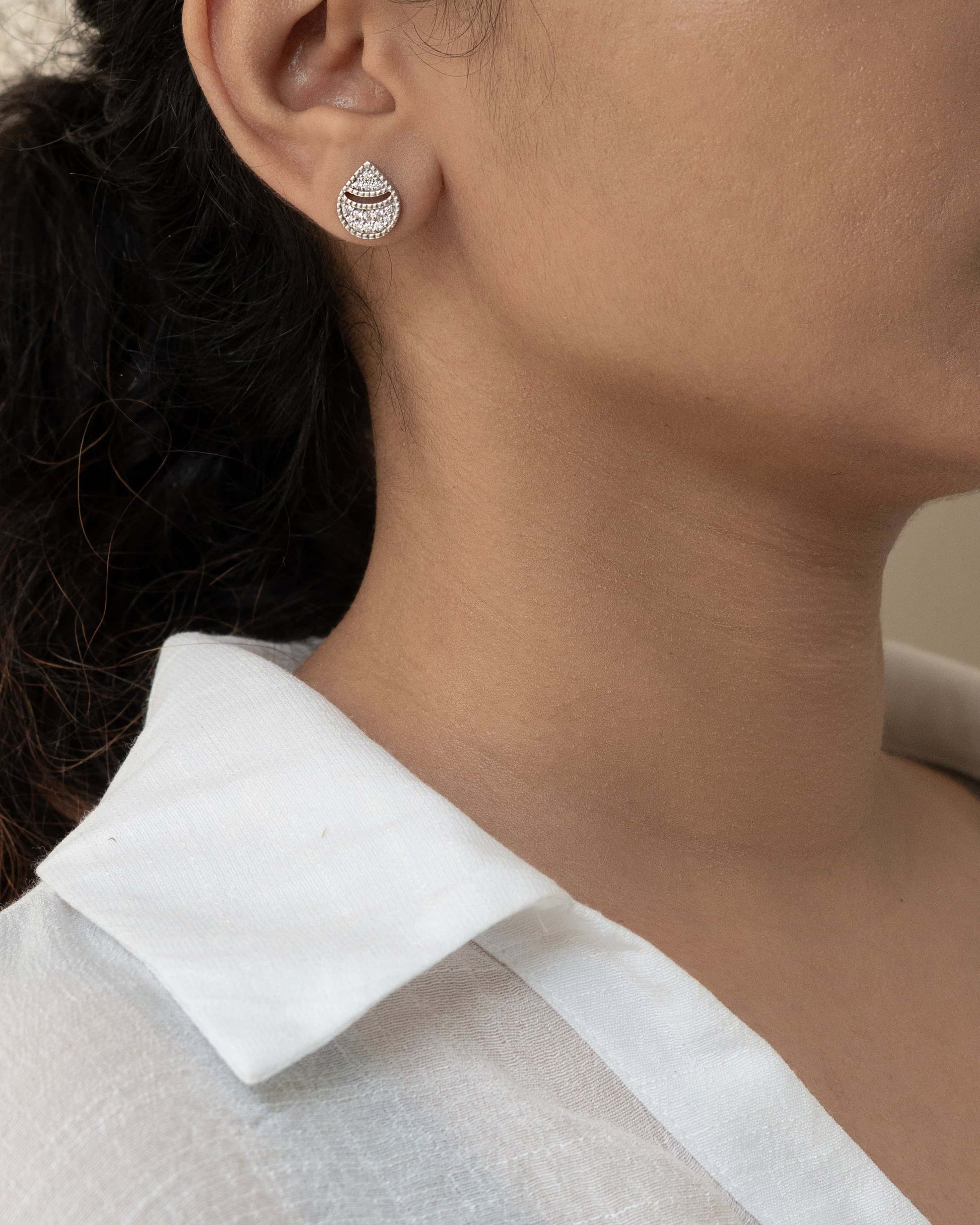 Raaga Stud is a quiet tribute to the classics—with a modern shimmer. Designed in a teardrop silhouette and handcrafted in 92.5% recycled silver, it features rows of brilliant white CZ diamonds layered in perfect symmetry. The form is soft, yet structured—like a raaga unfolding note by note. With its subtle curves and detailed setting, it adds just the right amount of ornament to your everyday elegance.