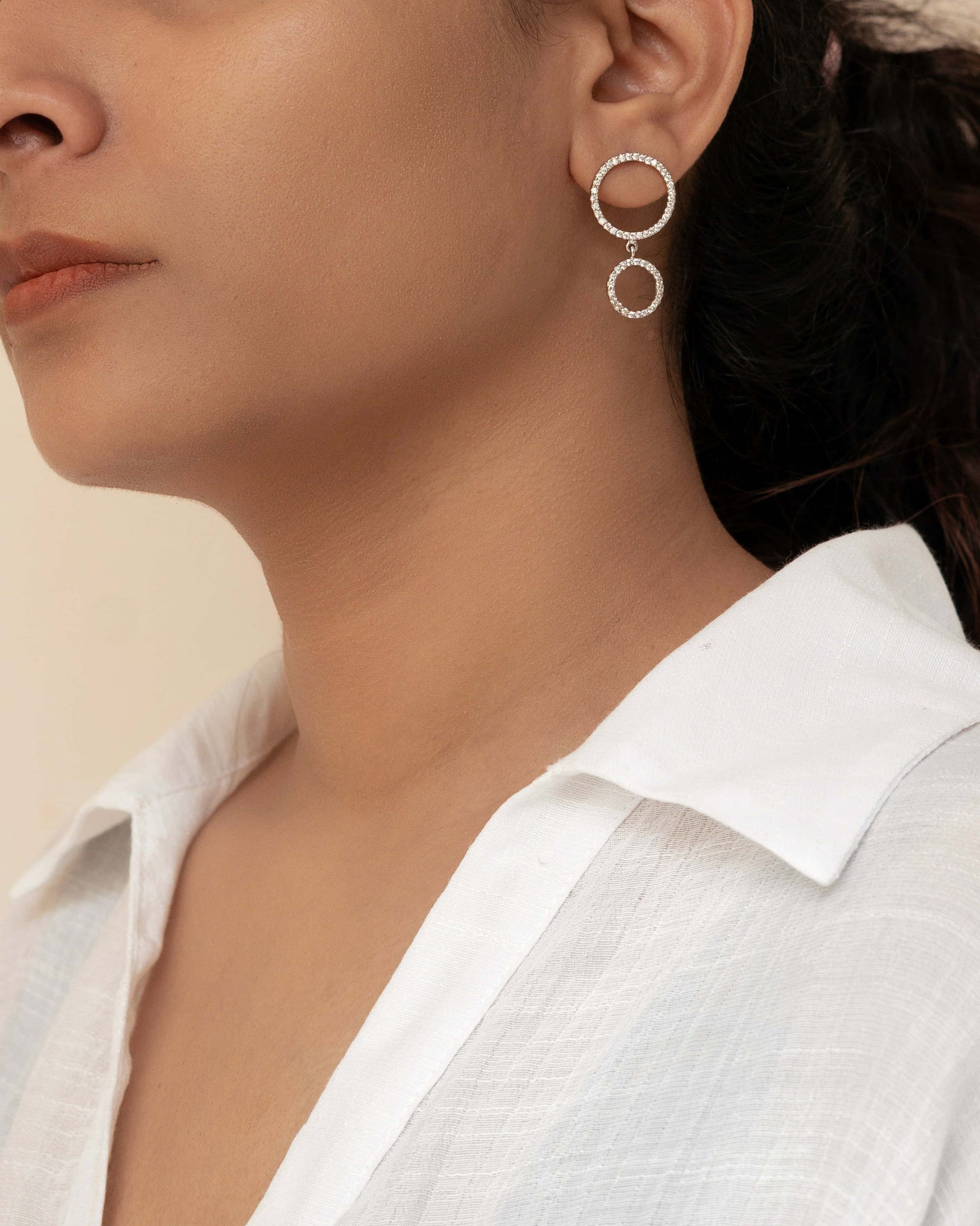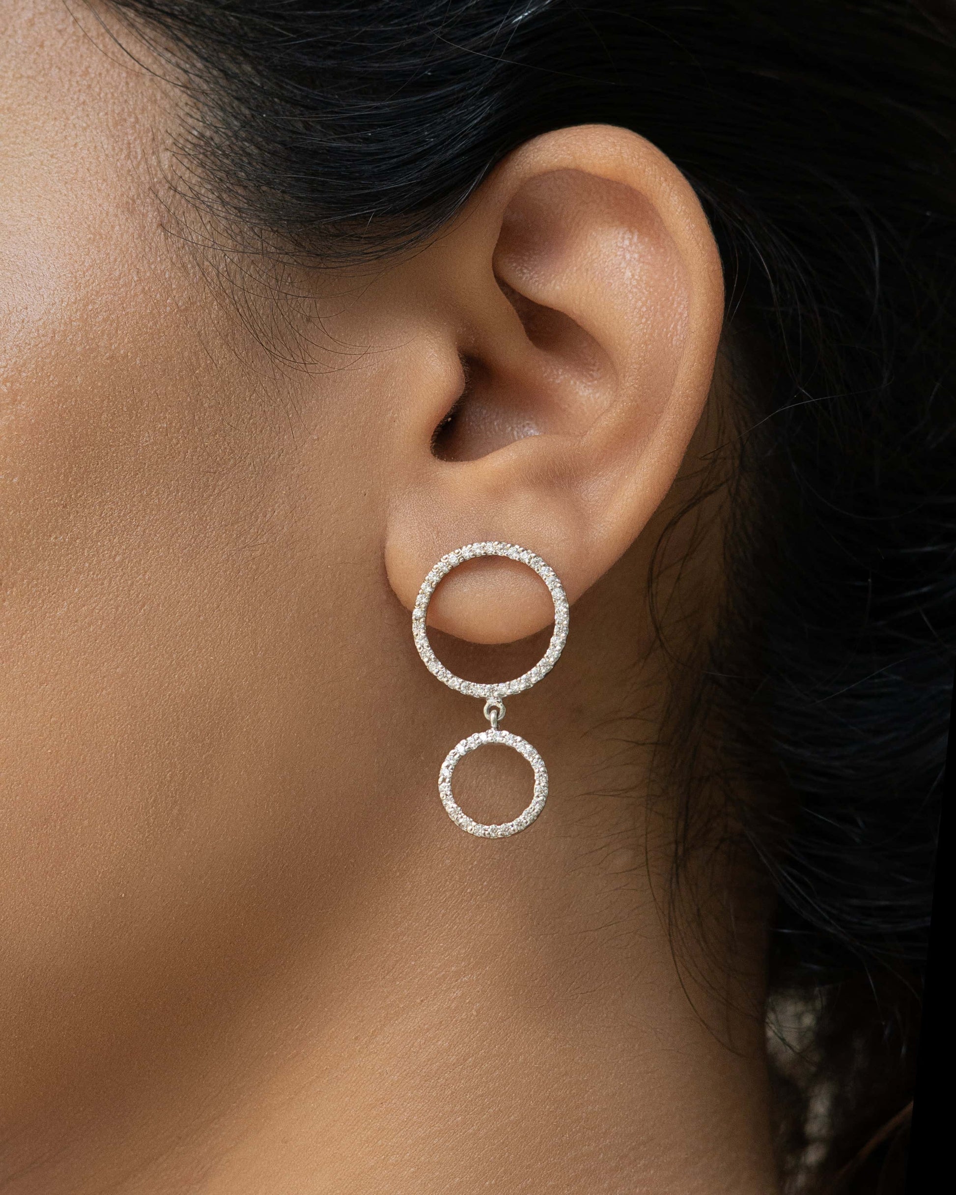 Twin Halo is a tribute to balance and movement—two perfect circles suspended in harmony. Handcrafted in 92.5% recycled silver and dusted with micro-set CZ diamonds, this piece sparkles with a quiet confidence.