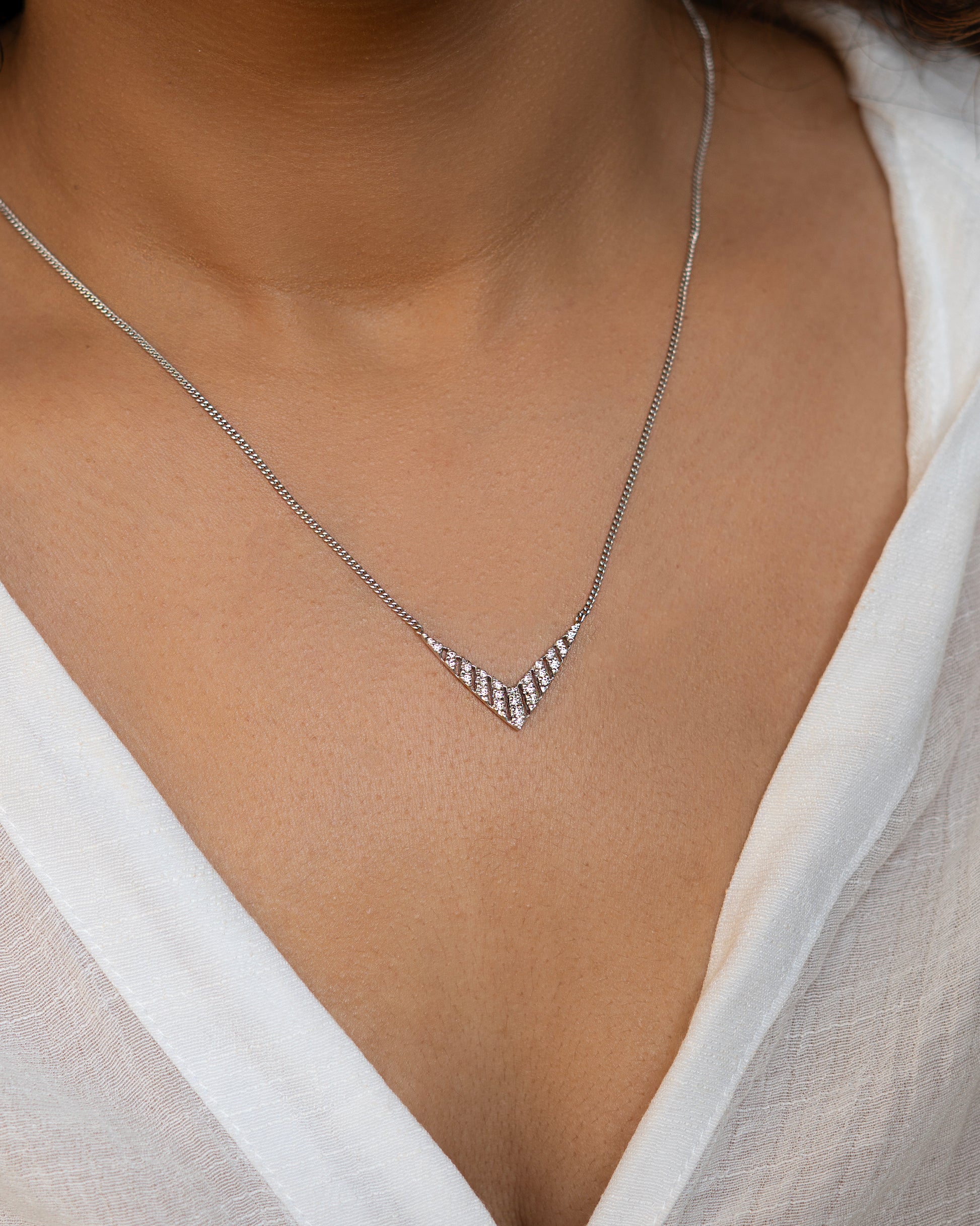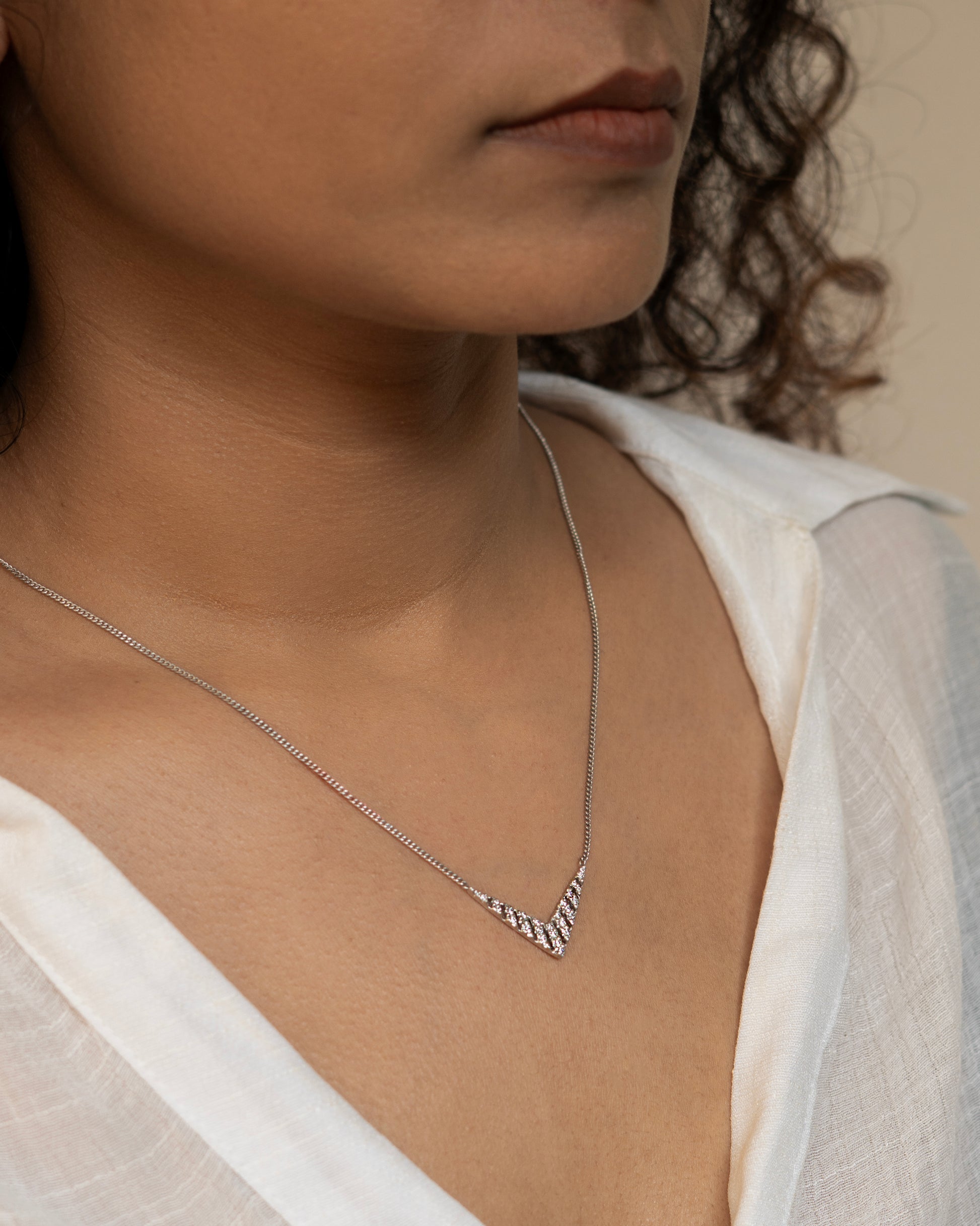 Vertex is handcrafted in 92.5% recycled silver and lined with rows of brilliant CZ stones, this pointed pendant draws the eye upward—sitting just at the collarbone like a quiet reminder of your inner direction.